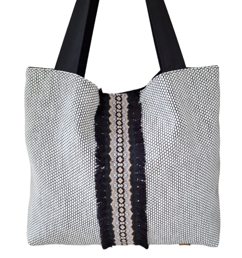 Χειροποίητη τσάντα με υφάσματα πολυτελείας με μαύρα και λευκά σχέδια, διακοσμημένη με φαρδιά τρέσα και κρόσια.