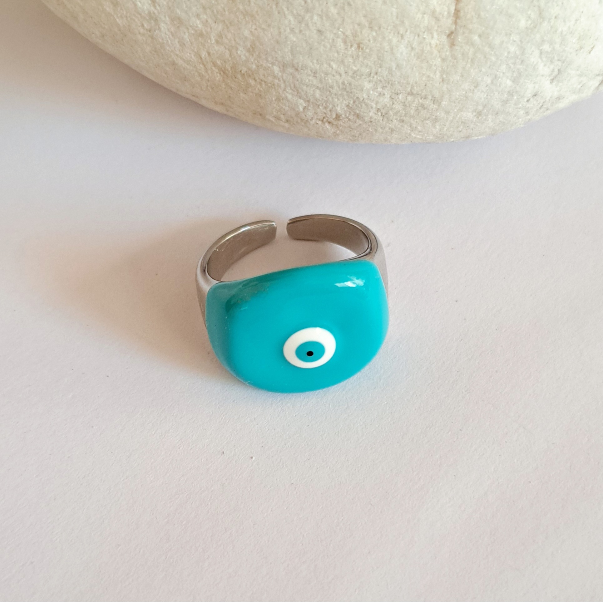 Δαχτυλίδι με μάτι από σμάλτο σε ασημι χρώμα από ανοξείδωτο ατσάλι.
