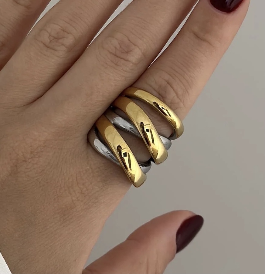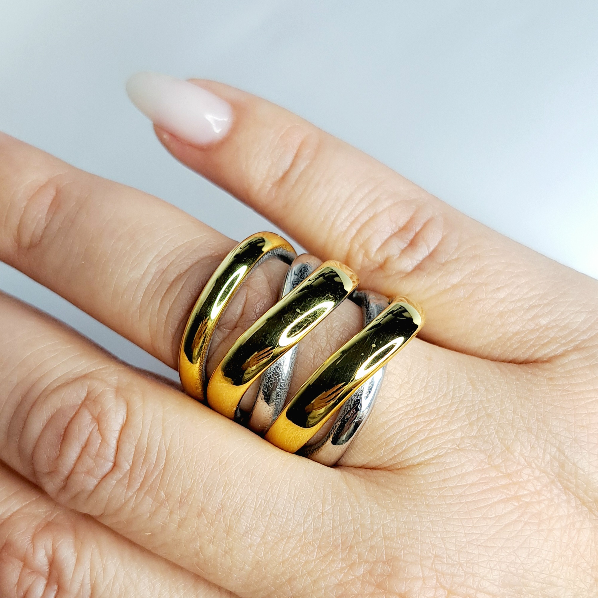 Ξεχωρίστε με αυτό το μοντέρνο και εντυπωσιακό δαχτυλίδι dual harmony, που συνδυάζει χρυσές και ασημί αποχρώσεις. Είναι κατασκευασμένο από υψηλής ποιότητας ανοξείδωτο ατσάλι επιχρυσωμένο και προσφέρει αντοχή, λάμψη και κομψότητα. Το μοναδικό του design αγκαλιάζει το δάχτυλο με ένα δυναμικό και ταυτόχρονα εκλεπτυσμένο στυλ.