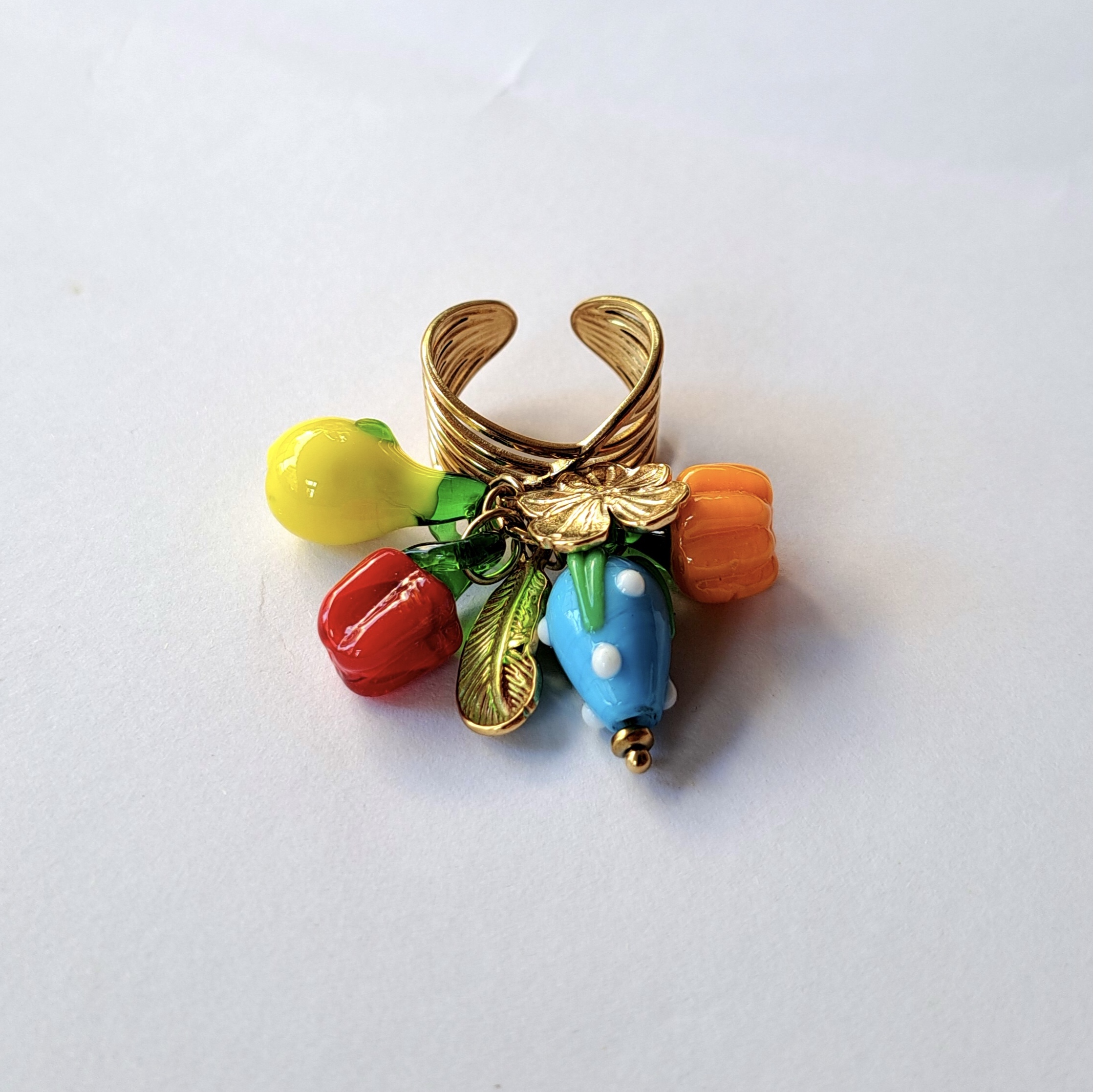 Το χρυσό δαχτυλίδι Luz είναι ένα statement κόσμημα που ξεχωρίζει με τα πολύχρωμα κρεμαστά murano charms.