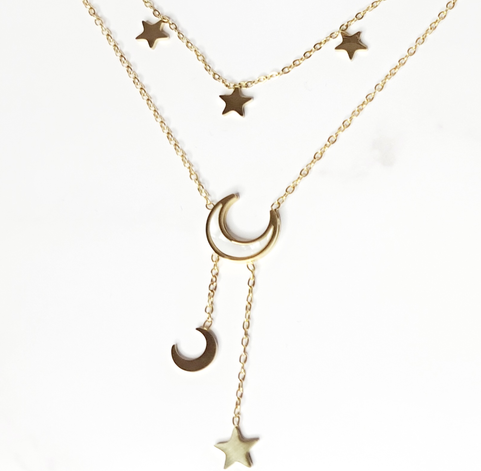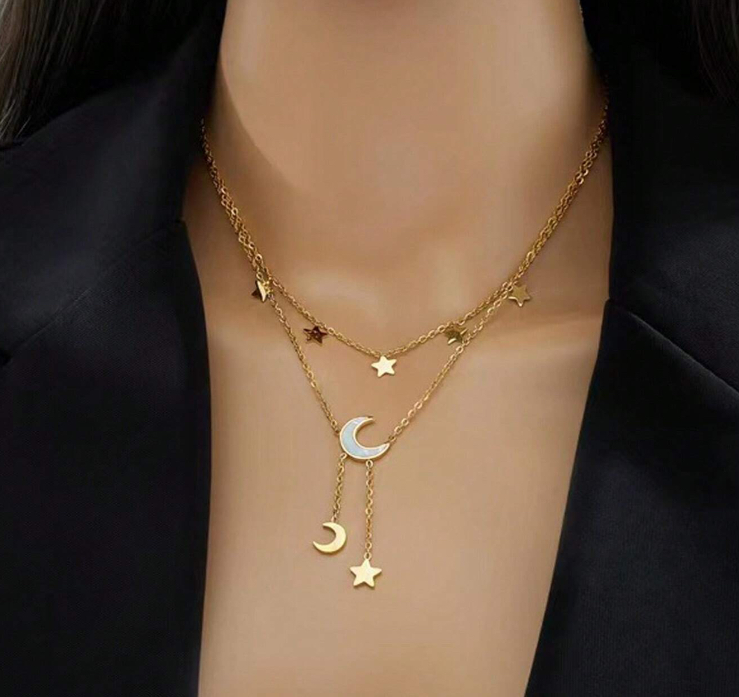 Κομψό διπλό κολιέ Lunaria από ανοξείδωτο ατσάλι με διακοσμητικά φεγγάρι και αστέρια. Μοναδικό σχέδιο για καθημερινές ή βραδινές εμφανίσεις, που προσθέτει λάμψη και ρομαντική διάθεση στο στυλ σας.