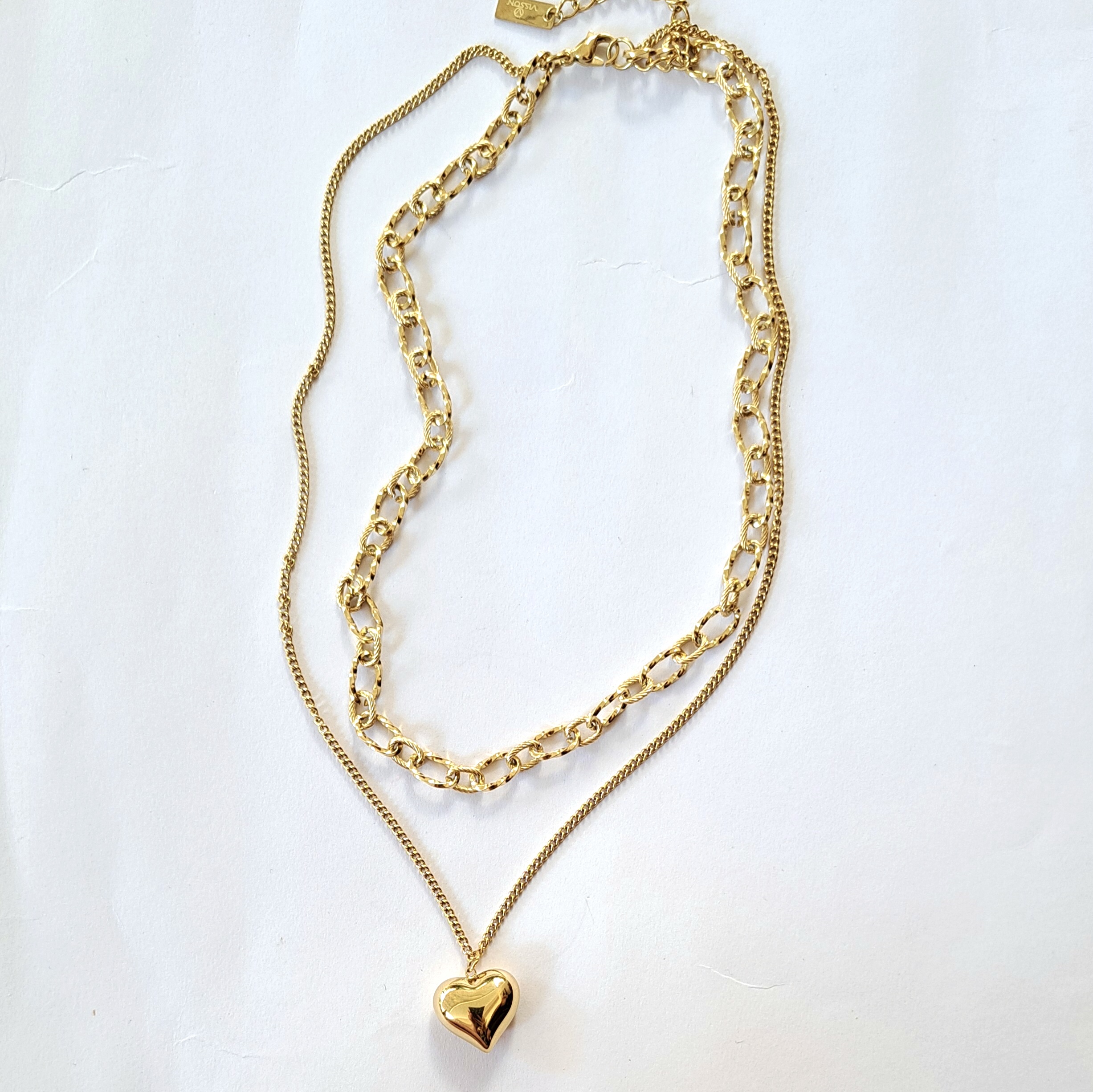 Διπλό κολιέ με καρδιά Velora από ανοξείδωτο ατσάλι υψηλής ποιότητας. Δύο διαφορετικά σχέδια αλυσίδας που συνδυάζονται αρμονικά, δημιουργώντας ένα μοντέρνο layering look . Η καρδιά προσθέτει μια ρομαντική πινελιά σε κάθε σου outfit.