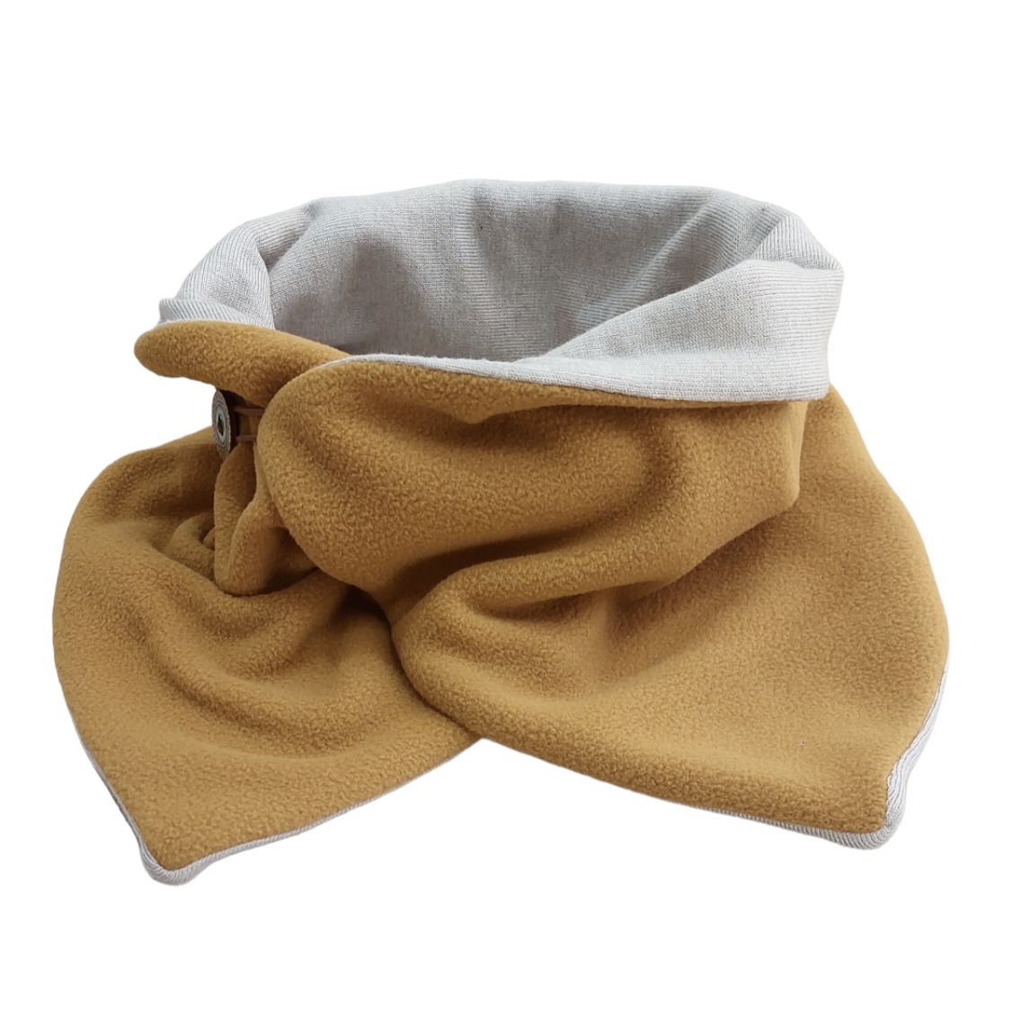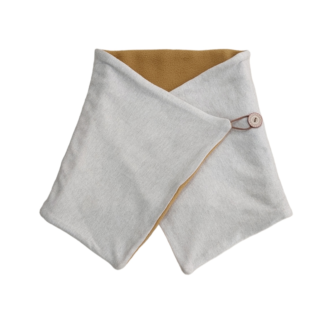 Χειροποίητος υφασμάτινος λαιμός-κασκόλ, σε μουσταρδί και μπεζ χρώμα, από εξαιρετικής ποιότητας ζεστά υφάσματα, που μπορεί να φορεθεί και από τις δύο όψεις (και οι δυο πλευρές έχουν κουμπί).