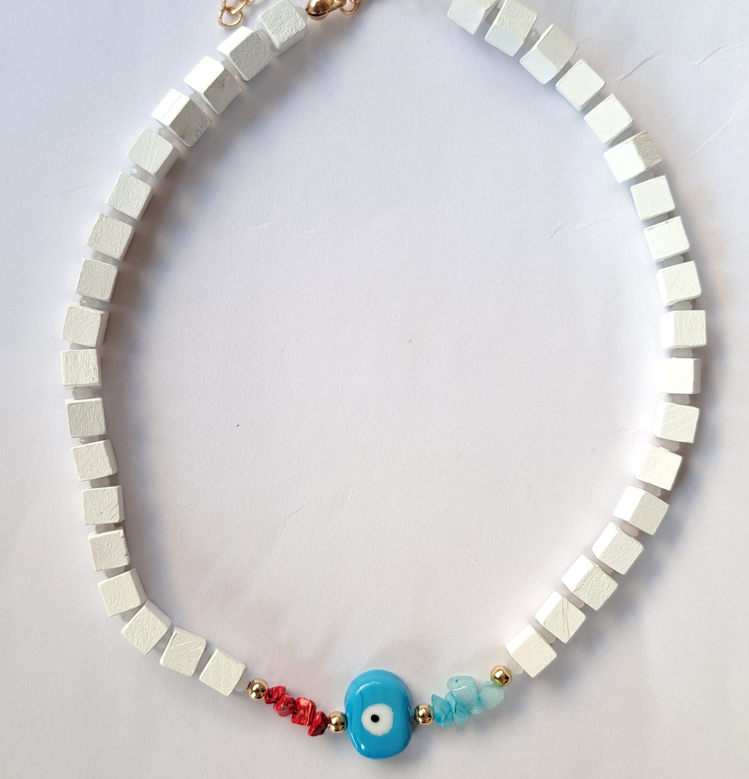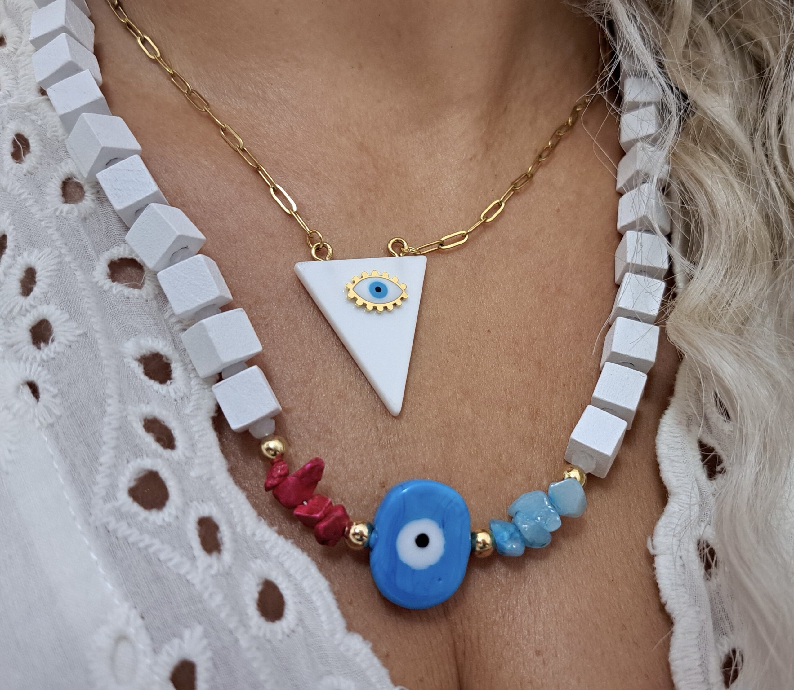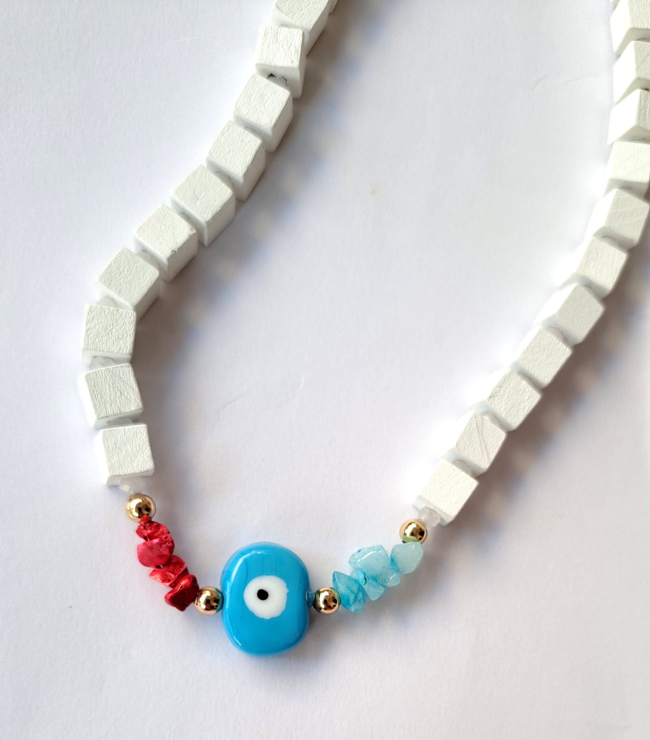 Το κολιέ Talya είναι το απόλυτο must have κόσμημα. Λευκές ξύλινες χάντρες, funky ακρυλικό μάτι και vibes που συνδυάζουν στείλει με προστασία.