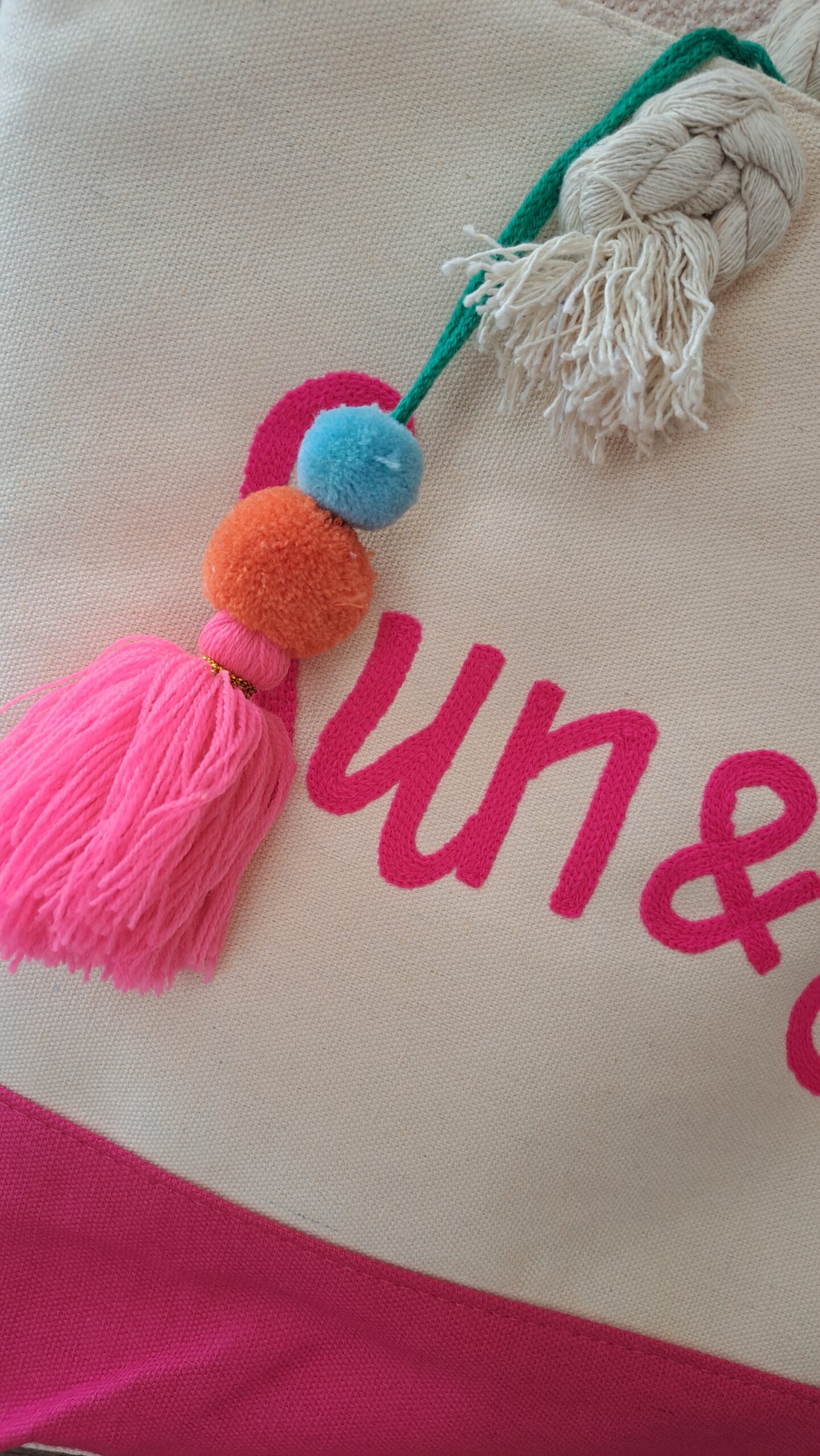Τσάντα θαλάσσης “Sun and Beach” με boho διάθεση. Διαθέτει αδιάβροχη φόδρα και κλείνει με φερμουάρ.