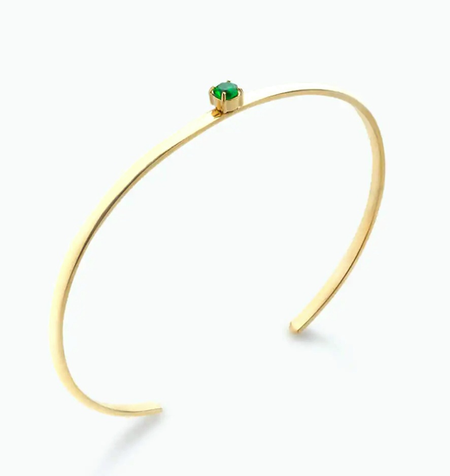 Βραχιόλι χρυσό ανοιχτό στο κάτω μέρος με πράσινο κρύσταλλο. Κατασκευασμένο από ανοξείδωτο ατσάλι, εύκαμπτο, μπορεί να προσαρμοστεί σε κάθε καρπό.