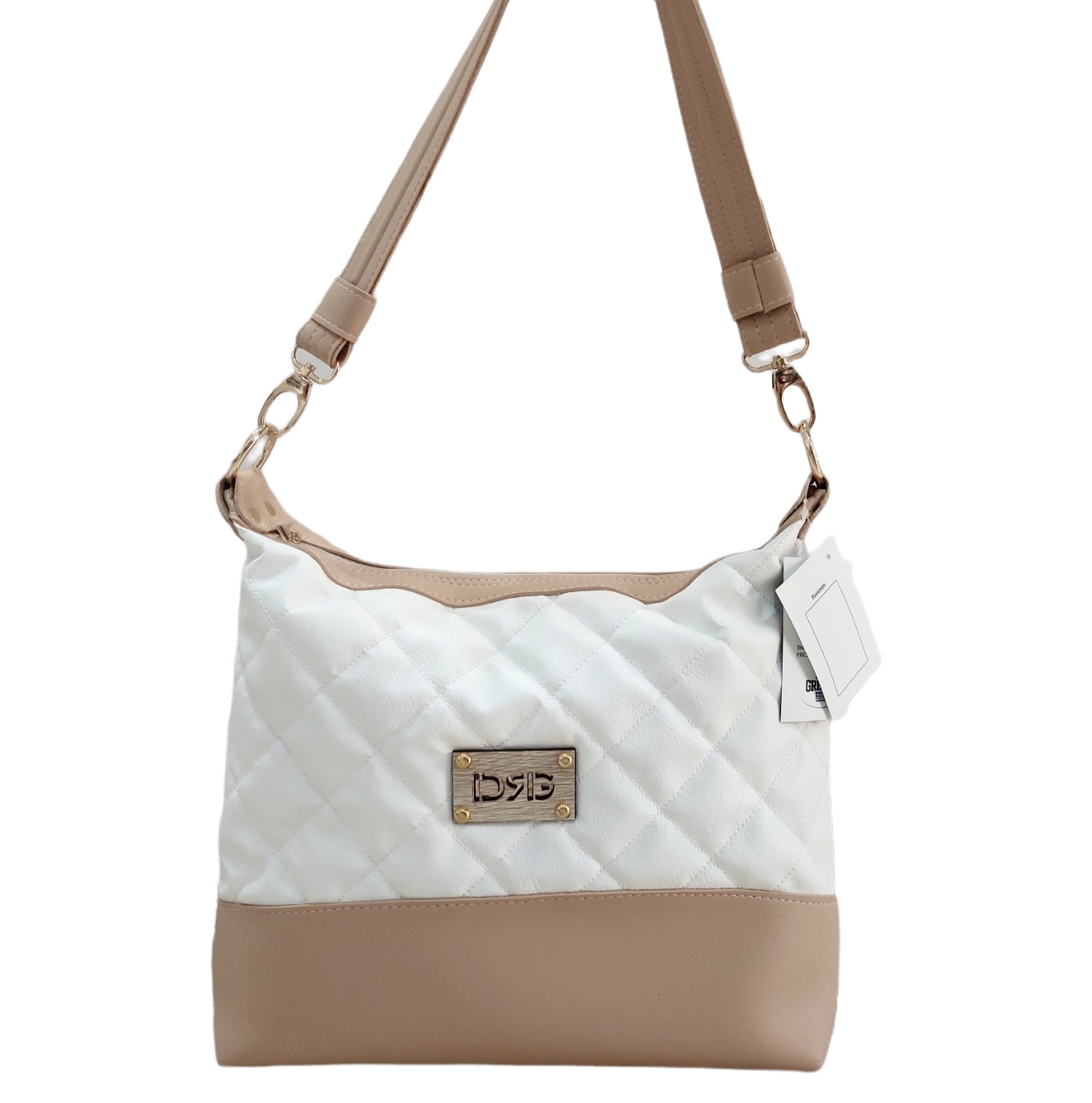 Χειροποίητη γυναικεία τσάντα ώμου DRG Ελληνικής κατασκευής, σε μπεζ χρώμα με λευκό καπιτονέ μπροστινό μέρος. Κλείνει με φερμουάρ.